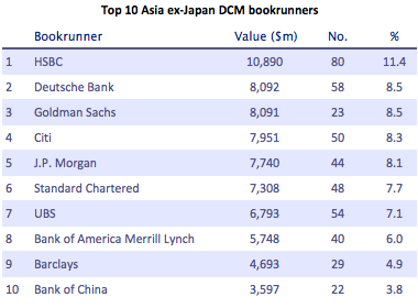HSBC continues to lead the league table ranking with $10.9 billion in 2013 year-to-date, while Deutsche jumps to second place with $8.1 billion. Goldman Sachs drops one spot and ranks third place, also with $8.1 billion.