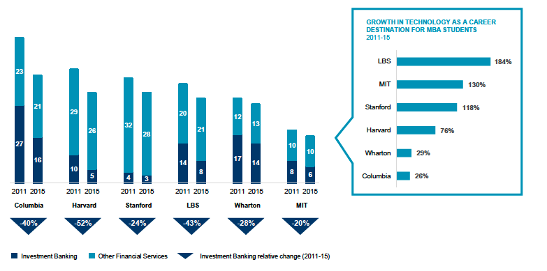 At Harvard Business School, the number of MBA graduates choosing a career in investment banking fell by 52% from 2011 to 2015. Similar trends are being observed at other leading business schools in the US, Europe and Asia, with graduates increasingly turning to careers in technology companies such as Facebook, Amazon and Google, according to research by Quinlan & Associates.