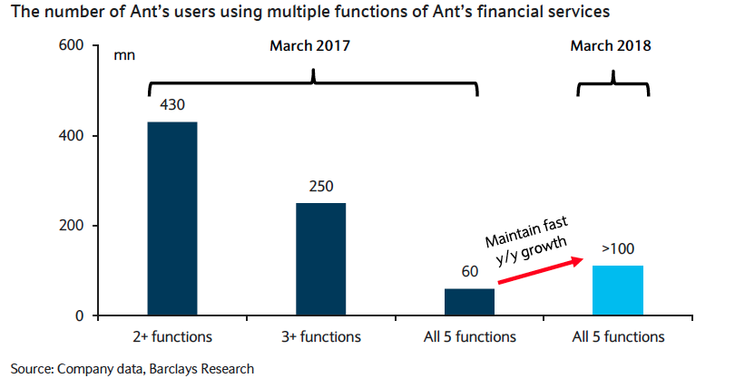 Users of all five of Ant’s main businesses — payments, wealth management, financing services, insurance and credit scoring — hit 60 million in March last year. Barclays estimated that measurement of Ant’s ability to cross-sell rose to over 100 million in March this year.