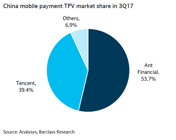 While Ant is growing rapidly, Tencent has the same idea. Tencent is unwilling to concede the field in offline retail payments which are also a gateway into Tencent’s digital marketplace. In the third quarter of 2017, Ant’s market share in total mobile payment volume in China was 53.7% while Tencent’s was 39.4%, according to Barclays and consultancy Analysys.