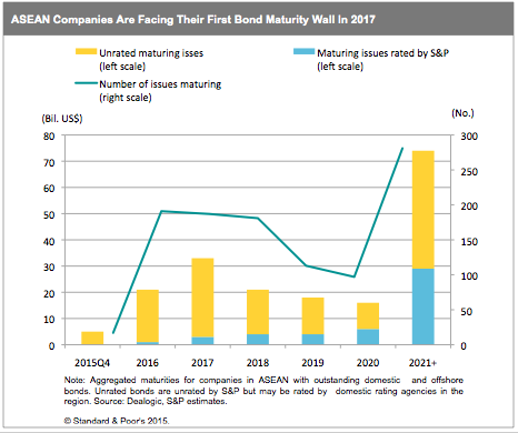 Most bonds coming due are unrated and were issued predominantly in Singapore, Indonesia, and Malaysia. Issuers raised these funds over 2012-2014 and benefited from very favorable funding costs. The relatively short tenors of bonds raised in Singapore (typically three years, compared with five years for a standard bond in US dollars) mean that issuers will need to refinance sooner -- and in a context where interest rates might have already started to normalize.