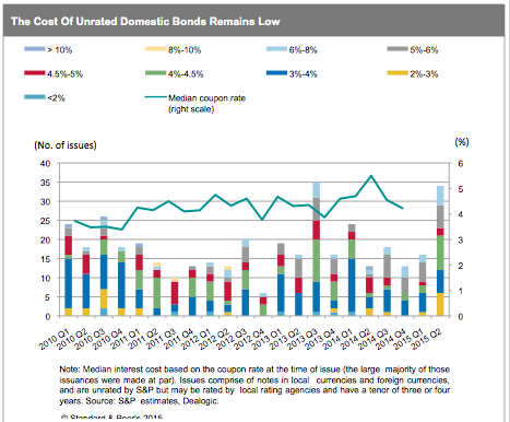 A normalization of funding costs for high-yield issuers has been taking place in the offshore bond market in the region since the beginning of 2015. But this normalization has been slow in the bank loan market, and is yet to happen in the domestic bond markets, where companies continue to raise funds at very low costs. We estimate the median coupon rate of about 4.2% and a spread over the corresponding US risk free rate of about 335 basis points for close to 400 unrated domestic bonds issues raised by non-government owned companies in the region between 2010 and 2015 and with maturities of three-to-four years (see chart 2 below).