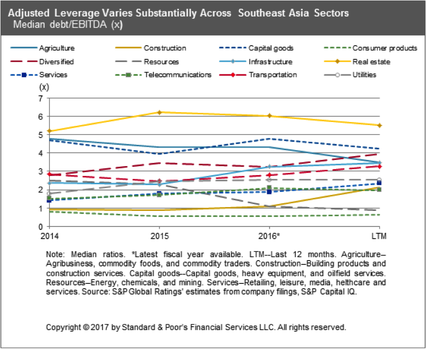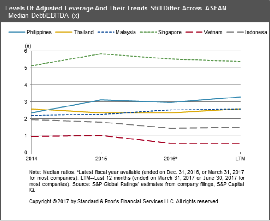 We believe ease of access to funding remains a key factor in leverage. Singapore, Philippines, Malaysia, and Thailand all have active and liquid local banking and capital markets. We also see that leverage tends to be above average among the most active issuers in these markets.