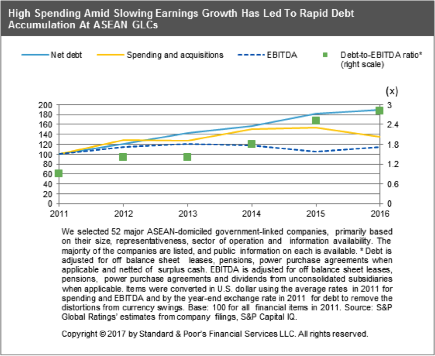Balance sheets are likely to erode further through 2018 as investment appetite remains high. Sustained spending may take its toll on the stand-alone credit profiles of these companies and they will require sizable external funding. As investments are often long-dated and do not generate immediate cash flows, we believe GLC balance sheets, which have weakened since 2011, will deteriorate further over the next three years at least. And that makes credit quality increasingly dependent on the willingness and ability of governments to support weaker GLCs.