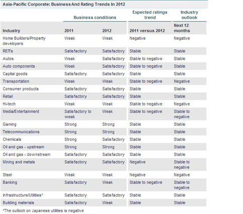 Our credit outlook for selected mining and metals, transportation, high technology and consumer electronic sectors in Asia-Pacific is negative in 2012. Our opinion is based on the weaker export outlook stemming from subdued global consumer demand, overcapacity in specific industries and high fuel prices. Our outlook on the Chinese real estate sector is also negative due to the Chinese government's initiatives to reduce economic growth to more sustainable levels and control asset bubbles in the property market in particular.