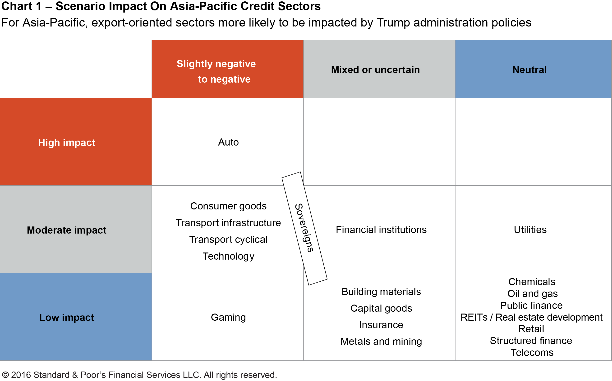 If future US policy-making follows through with trade restrictions, Asia-Pacific industries with international exposure will be particularly impacted. Trade restrictions would have a highly negative impact on the Asia-Pacific auto industry, and a moderate negative impact on the consumer goods, transport — cyclical, transport–infrastructure and technology sectors.