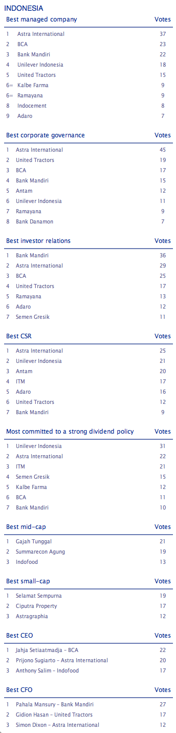 We have tallied votes from 265 investors and analysts across the region for our 12th annual poll of Asia's top companies. The results will be published country by country during the course of the next week, before finally revealing which companies are viewed to be the best managed in the region in 10 key industries.
