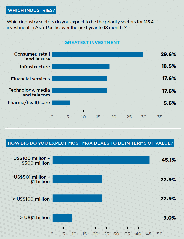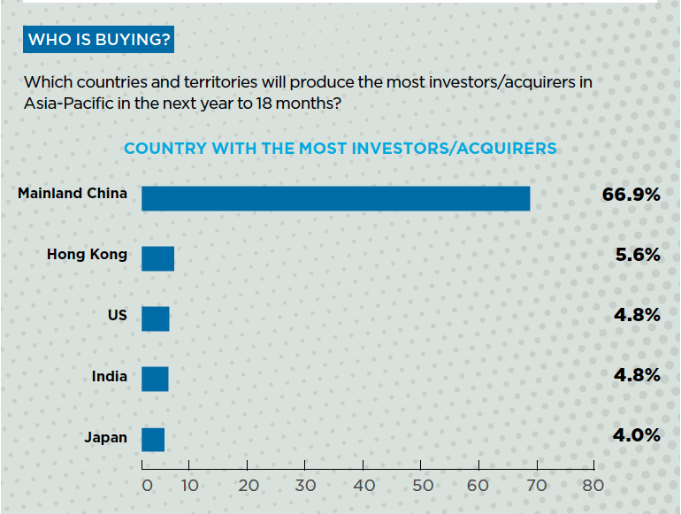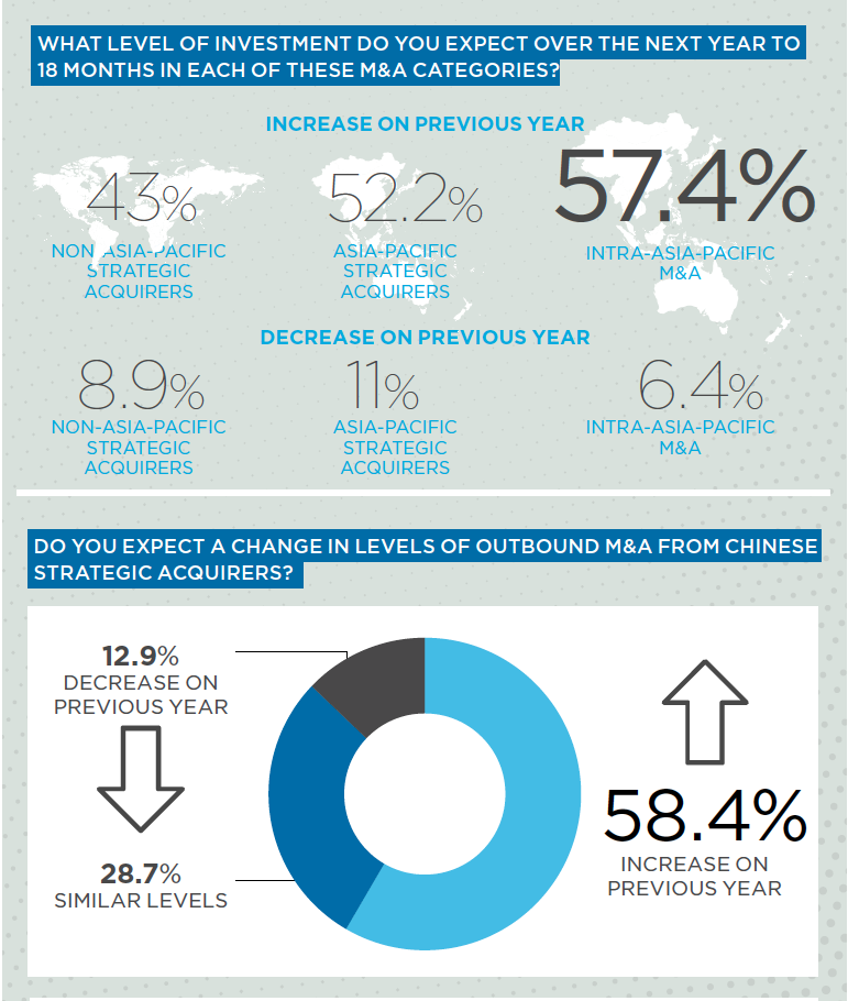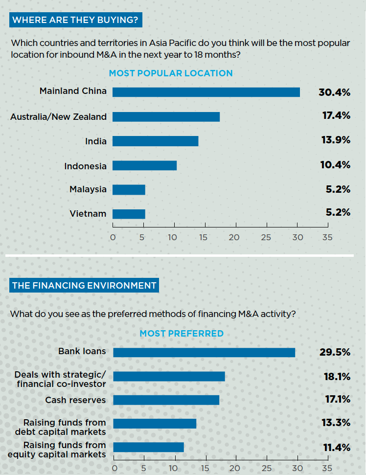 Within the Asia-Pacific region, China still headlines as the top choice for inbound M&A over the next year, with 30.4% of those surveyed saying so compared with 26.6% a year earlier.