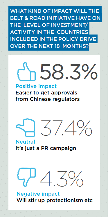 Over 58% of respondents said it will have a “positive impact” on investment/activity levels in the markets involved, though 37.4% felt it was more talk than walk and are initially “neutral” on its upside deal-flow potential. Belt and Road is expected to cover some 68 nations.