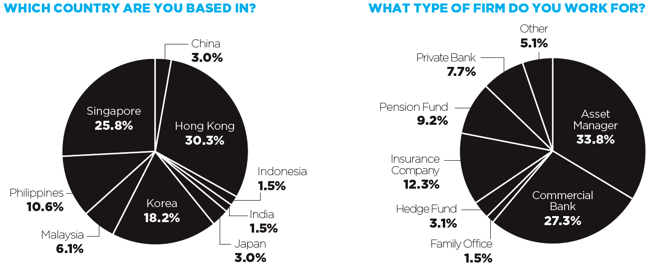 Some 65 investors representing all types of firms participated in this year’s survey, although a larger proportion of asset managers and pension funds took part and fewer hedge funds participated. Geographically, the respondents were spread more evenly between countries than in previous years with 20% indicating they were based in Hong Kong, 26% in Singapore, 18% in Korea, 11% in the Philippines and 6.1% in Malaysia.