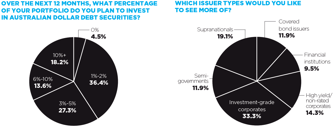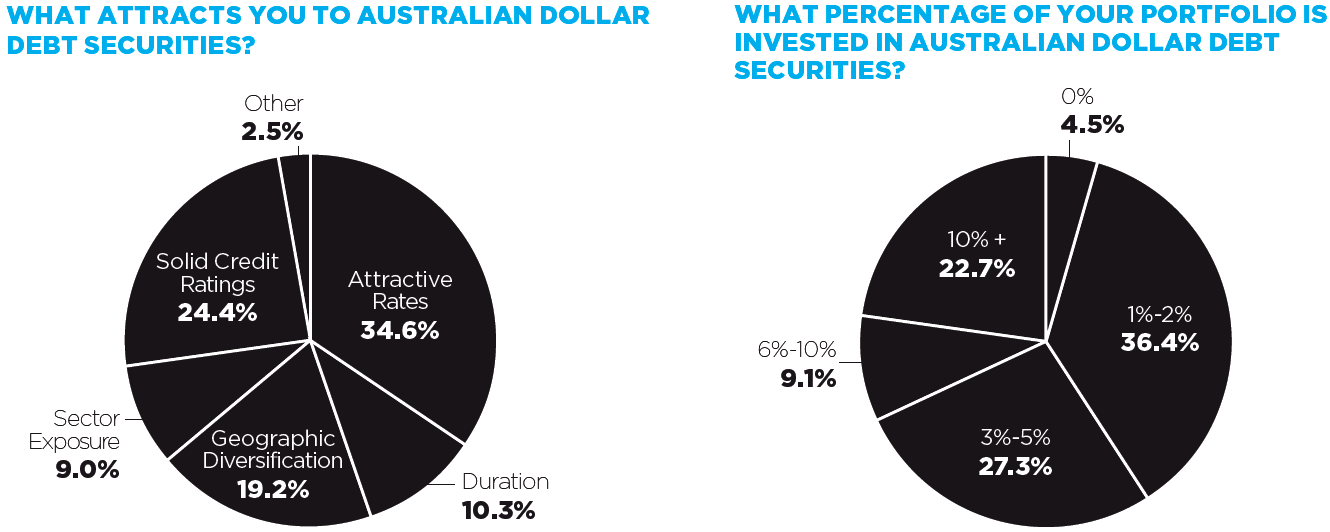 More than 27% of respondents now have 3-5% of their portfolio dedicated to Australian dollar debt securities compared to 23% in 2015 and 17% in 2014. Meanwhile, those with a 1-2% allocation now make up 36% of all investors polled compared to 27% in 2015 and 15% in 2014.