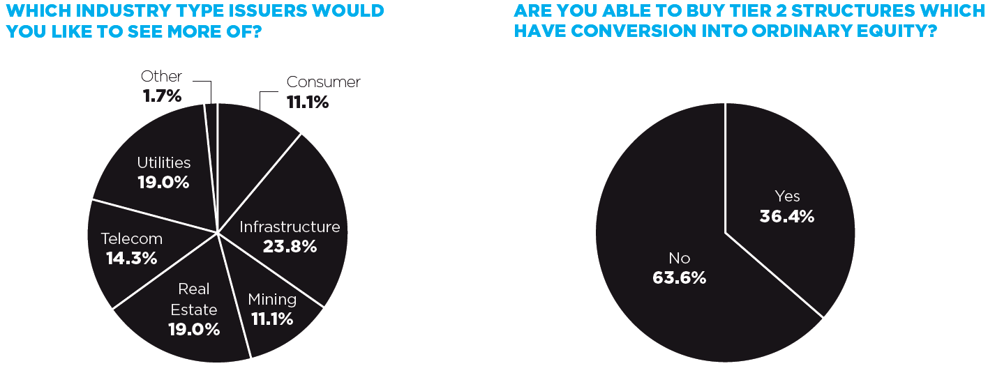 There was also a drop in appetite for financial institutions, indicating investors may be reaching exposure limits on some of these credits. This year only 9% of respondents said they would like to see more issuance from banks compared to 20% last year and 33% in 2014.