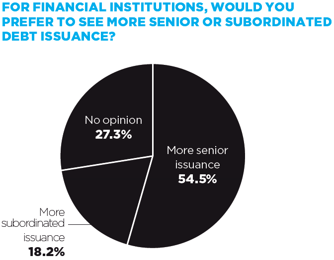 Furthermore, senior debt is preferred over subordinated issuance. “This is likely to be driven by a focus on credit quality but also points to the uncertain regulatory environment,” said Sokaris, interpreting why only 18% of participants said they would like to see more subordinated debt from bank issuers. “The market is waiting on some clarity around how senior and subordinated debt will be treated under new banking rules. Investors are still evaluating the risks in the unsecured portion of their portfolios and the poll results show they aren’t so focused on the sub-debt piece.”