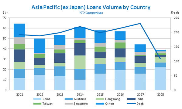 - In China, syndicated loan volume stands at $22.0 billion via 41 deals in 2018 YTD, up 37% from $16.1 billion borrowed in the same period of 2017.