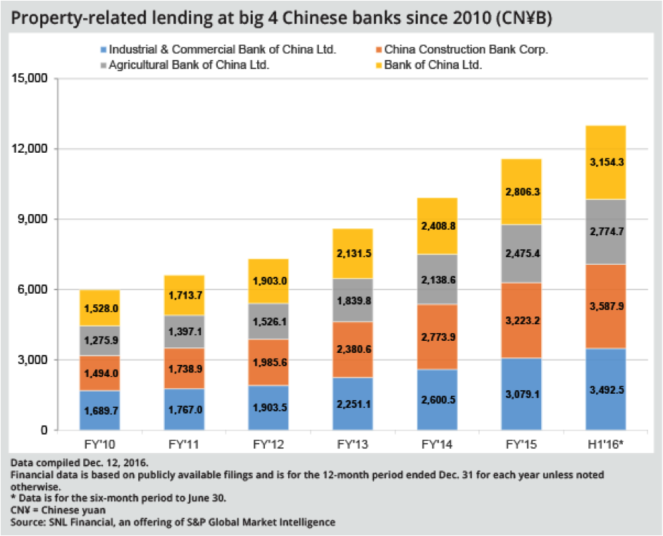 The total value of lending exposure to homebuyers as well as commercial and residential real estate developers at Industrial & Commercial Bank of China Ltd., Bank of China Ltd., China Construction Bank Corp. and Agricultural Bank of China Ltd. rose to 13.009 trillion yuan as of June from 11.584 trillion yuan at the end of 2015, according to data compiled by S&P Global Market Intelligence.