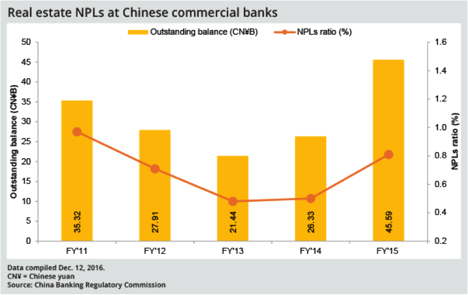 The combined NPL ratio for property-related lending at Chinese commercial banks was 0.81% as of the end of 2015, lower than the overall 1.67% NPL ratio for the commercial banking sector.