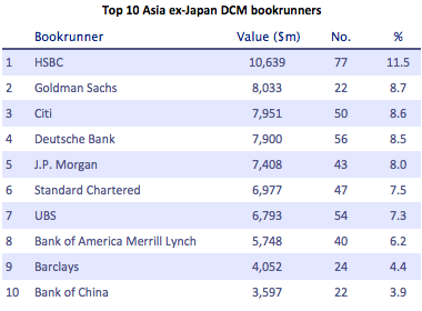 HSBC leads the league table ranking with $10.6 billion in 2013 year-to-date, followed by Goldman Sachs and Citi, respectively.