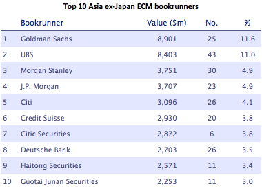Goldman Sachs continues to lead the league table ranking with $8.9 billion, followed by UBS and Morgan Stanley.