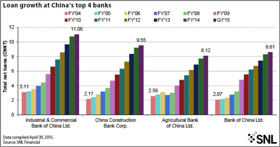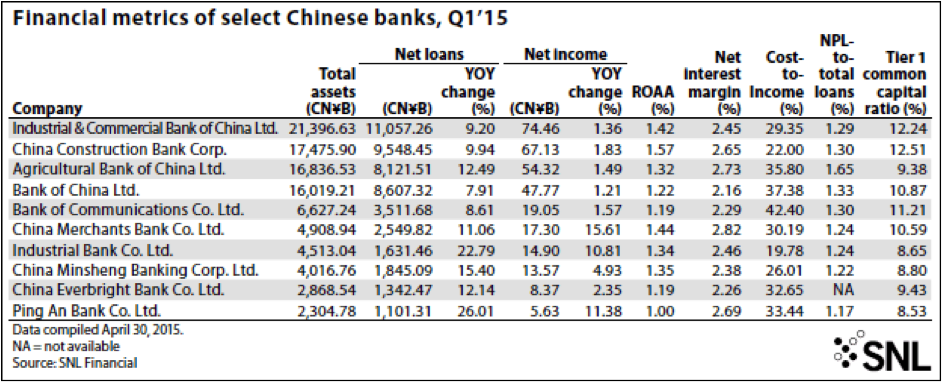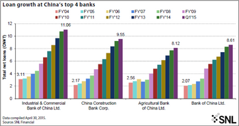 Loan growth at the banks has slowed but may pick up speed again as China's central bank intensifies monetary easing. The People's Bank of China in May cut its benchmark rates for the third time since November 2014 when the central bank started easing to revive economic growth, which in the first quarter slowed to the lowest rate since 2009. In April, the central bank also lowered reserve requirements for banks by 100 basis points, the second industrywide easing since February and the first reduction of that magnitude since the fourth quarter of 2008 when the financial crisis was in full swing.
