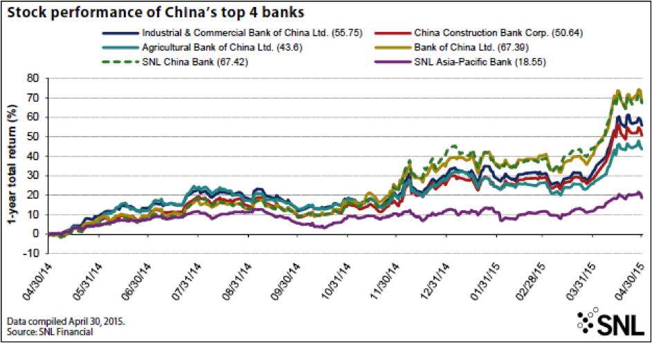 At least in the short term, growing loan volumes are not a bad thing for Chinese banks, helping them lift their bottom lines. At all of the four biggest Chinese banks, net interest margins contracted at the end of March, but they eked out small gains in first-quarter net profit. Their shares are also sharply up from where they were at the start of 2015.