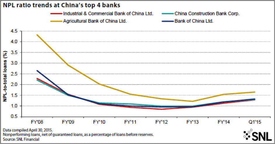 NPL ratios at the four largest banks in China — Industrial & Commercial Bank of China Ltd., China Construction Bank Corp., Bank of China Ltd. and Agricultural Bank of China Ltd. — have been on the rise in recent years.