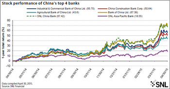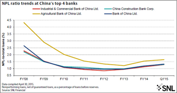 At the end of March, Agricultural Bank of China had the highest NPL ratio of 1.65% among the four banks, followed by Bank of China with 1.33%, China Construction Bank with 1.30% and ICBC with 1.29%. On an annual basis, the metric climbed for two consecutive years through 2014 at ICBC and Bank of China. At all of the banks except for Agricultural Bank of China, the figures were at five-year highs at the end of 2014, company data compiled by SNL Financial show.