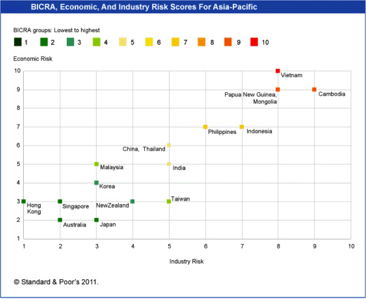 Given China’s sizeable economy and connections within Asia-Pacific and the world, its performance is one of the key credit sensitivities for many banks in the region and could generate ripple effects globally. While we assigned a BICRA score of '5' to China, which is slightly higher than the average score for Asia-Pacific, we recognize the “high risk” of economic imbalance in China, as well as its high credit risk. Significant adverse economic developments in China are likely to generate much bigger shocks than most other Asia-Pacific economies. Such a negative impact would be felt by economies that supply raw materials or semi-finished goods to Chinese industries.