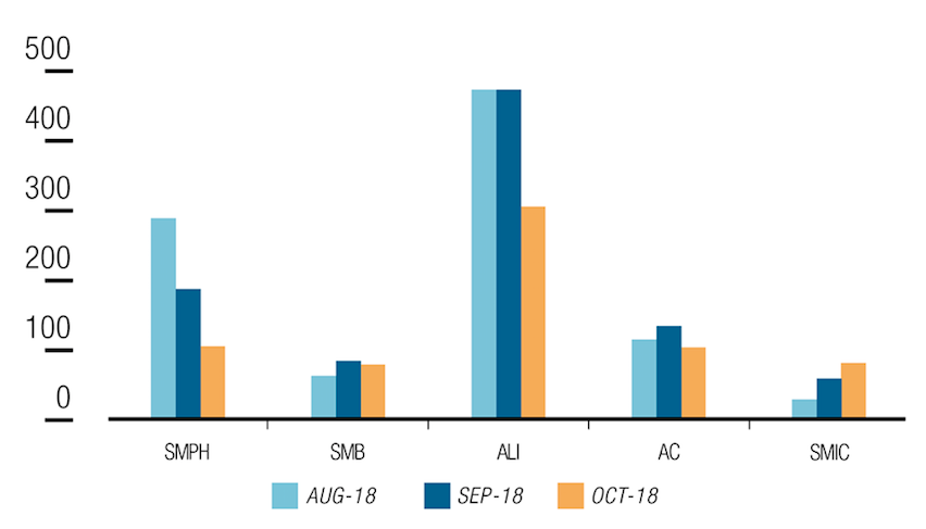 Monthly trading volume (in million pesos) of top fie corporate bonds (Aug-Oct 2018)