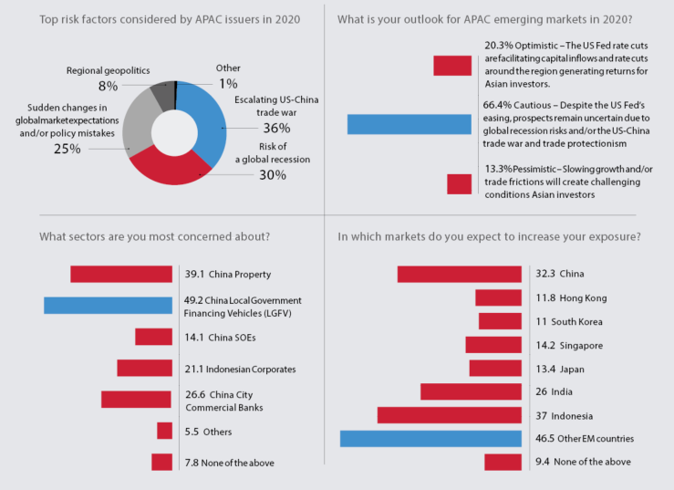 Indeed, what stands out from the survey results is its relatively downbeat tone and its focus on international politics, although it is worth mentioning that the survey was conducted before a Phase One trade deal was announced between the US and China in early December. As a result, two-thirds of respondents cited the escalating trade war and recession as the biggest risks for Asia Pacific issuers.