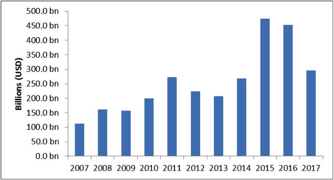 On a completed deal value basis, the growth was even more pronounced at 161% for a total deal value of $295.9bn in 2017. Also notable was the increase in average deal sizes, from $72.7m in 2007 to $109.7m in the peak year of 2015, to $112.1m in 2017. 2017 was led by three deals with transaction values of $5.0bn or higher, including the $9.3bn acquisition of China United Network Communications Limited by a consortium of investors.