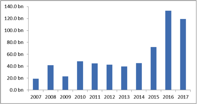 In 2017, total outbound investment from China has seen a decrease to 597 deals at $119.2bn, which represent 22% and 10% declines compared to 2016. While this decline is less than the decline for domestic activity, it may not yet fully reflect the China regulatory pressures on outbound M&A, which is more apparent in announced transaction activity rather than deal completions.