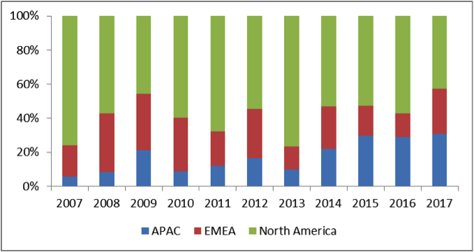 In terms of where capital was invested globally, the majority of the capital has historically been invested into North American IT companies, standing at $51.8bn in 2017 across 2,272 new deals. This was a decline from a strong 2016 for North America-based IT targets, that attracted a record $77.6bn of new money from global GPs. IT companies in APAC and EMEA, have still been lagging behind with $37.4bn and $32.3bn, respectively.