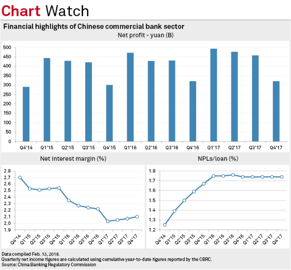 Net profit at Chinese commercial banks remained near flat in the fourth quarter of 2017 as net interest margin, a key profitability metric, was still compressed, data from the China Banking Regulatory Commission shows.