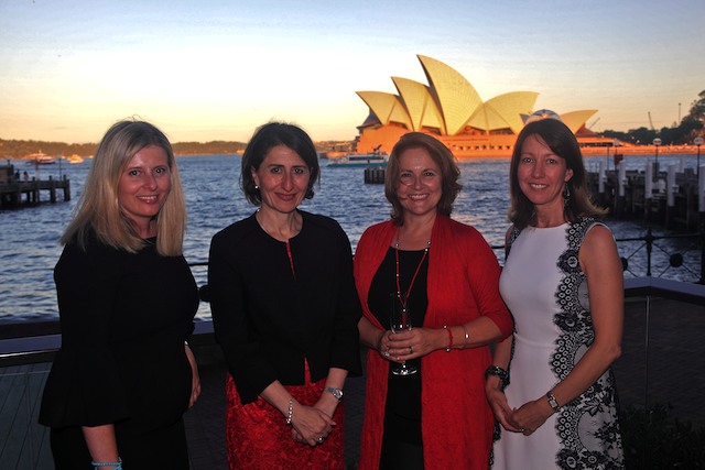 UBS’s Caroline Gurney, NSW Treasurer Gladys Berejiklian and FinanceAsia’s Vicki Shaw and Cherie Marriott begin the evening with a drink on the harbour