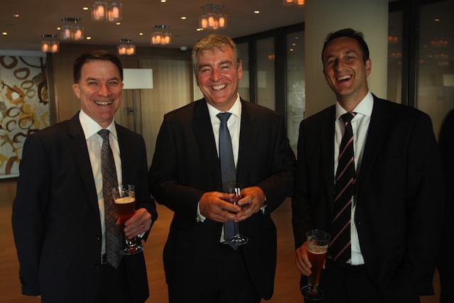 Bruce MacDiarmid of Deutsche Bank (centre) and colleagues share a pre-dinner drink