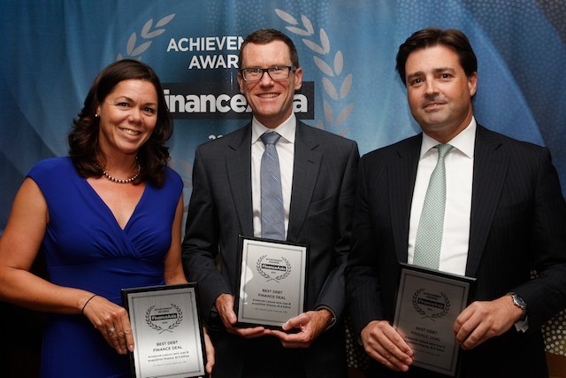 Julie Cameron-Doe of Aristocrat Leisure with UBS’s Lance McKegg and Citi’s Lachlan Tracey collect the Best Debt Finance Deal award