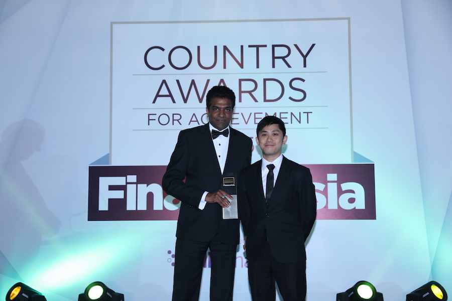 Commercial Bank CFO Nandika Buddhipala accepts the award for Best Bank in Sri Lanka from FinanceAsia's Danny Leung.