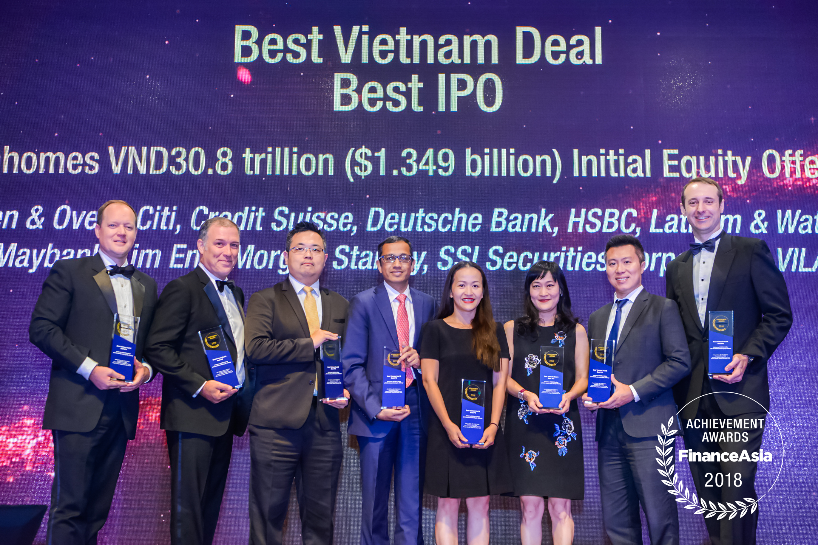 Best IPO and Best Vietnam Deal: Vingroup chief investment officer Anne Pham (4th right) and representatives from Allen & Overy, Citi, Deutsche Bank HSBC, Maybank Kim Eng, Morgan Stanley and SSI Securities