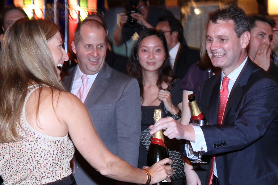 HSBCÆs Rod Sykes put most of the crowd to shame in the quiz by winning five(!) bottles of champagne. BoA MerrillÆs Rich Linebaugh and HSBCÆs Sandy Lau looks on in wonder
