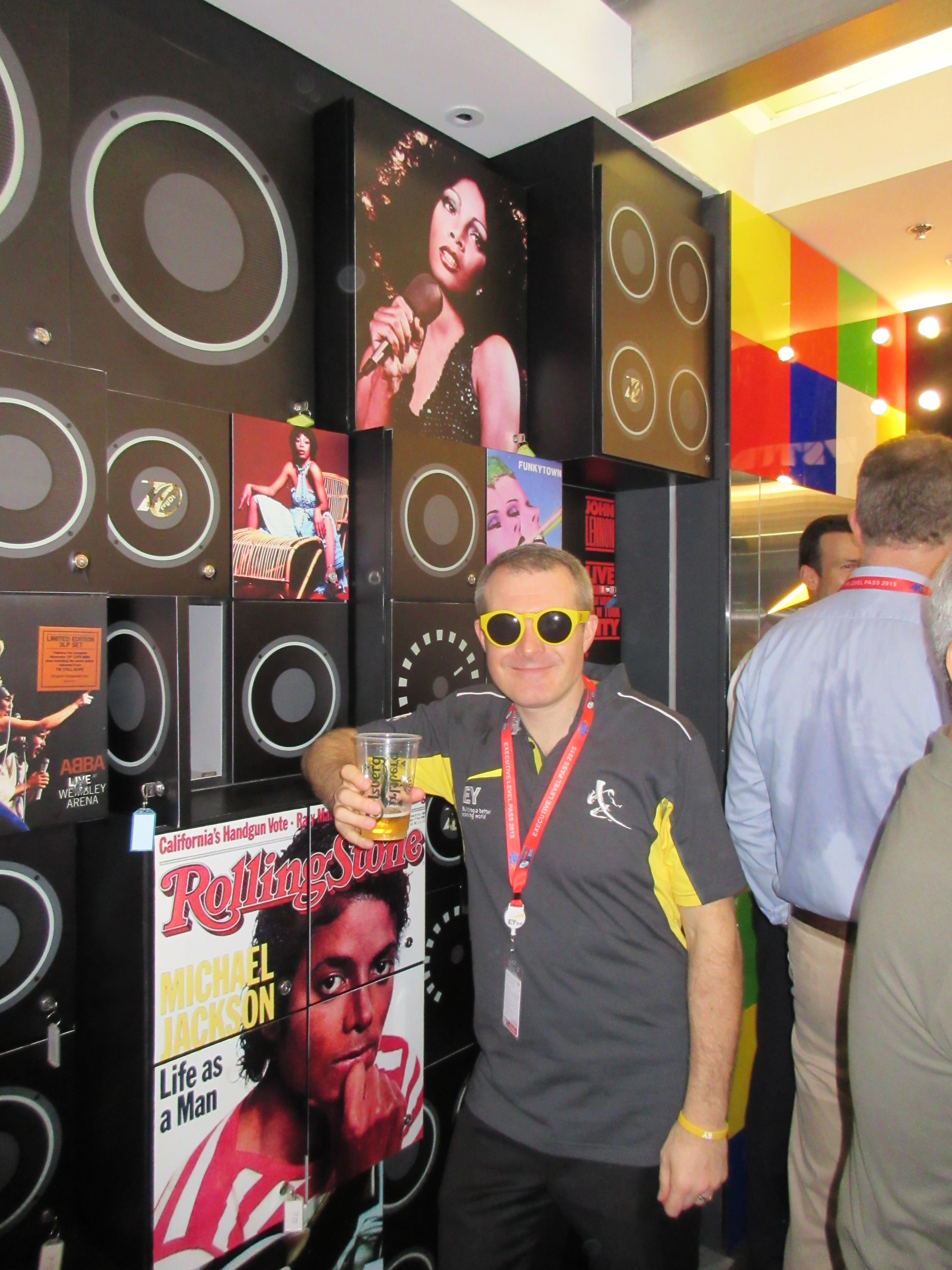 70s child Keith Pogson, EY senior partner in financial services Asia Pacific, bends an elbow in the consultancy's 70s-themed box at the Sevens