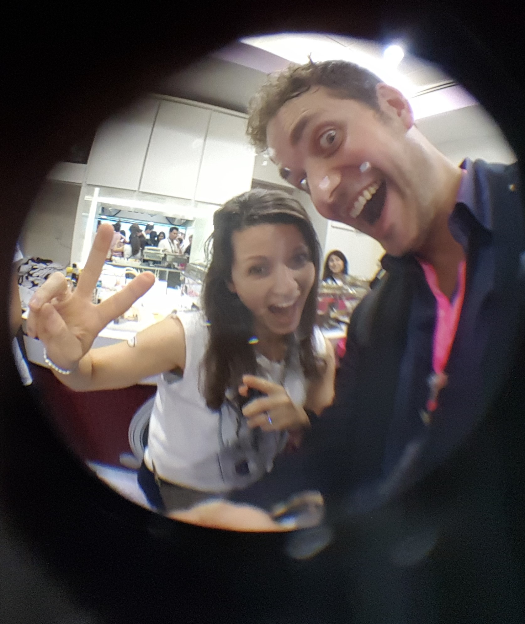 Elodie Coscas, head of client marketing at UBS and FinanceAsia's Richard Morrow, test out the UBS fisheye camera accessories.