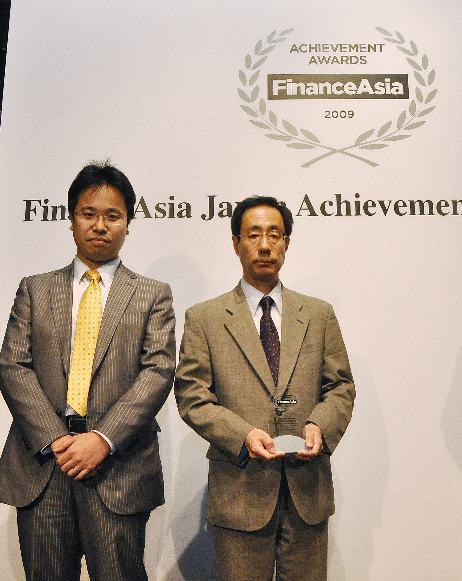 Daiwa's Motoi Takahashi and NomuraÆs Naohisa Ando accept the Best Secondary Equity Offering award for Mitsubishi UFJÆs Yen1.1. Trillion follow-on