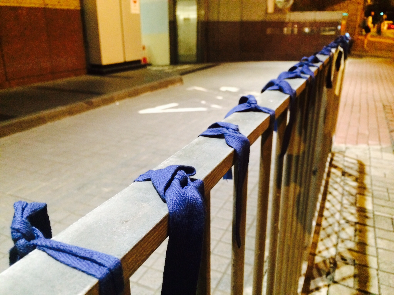 Opponents of the Occupy movement adopt the blue ribbon. These were in North Point